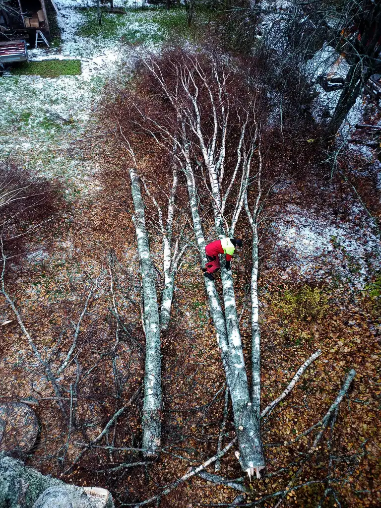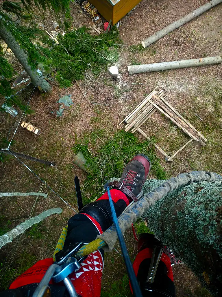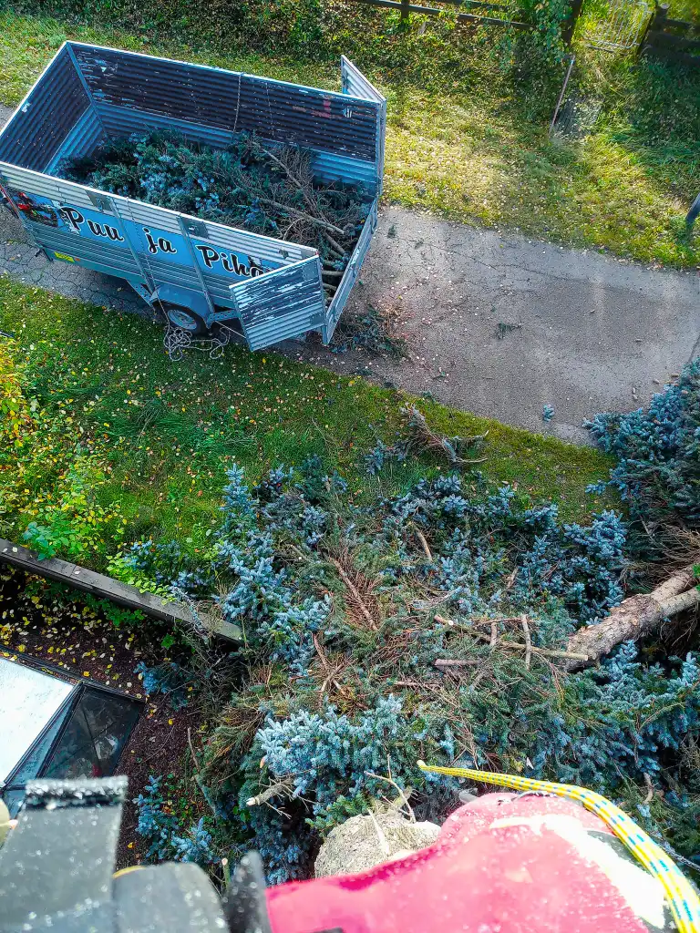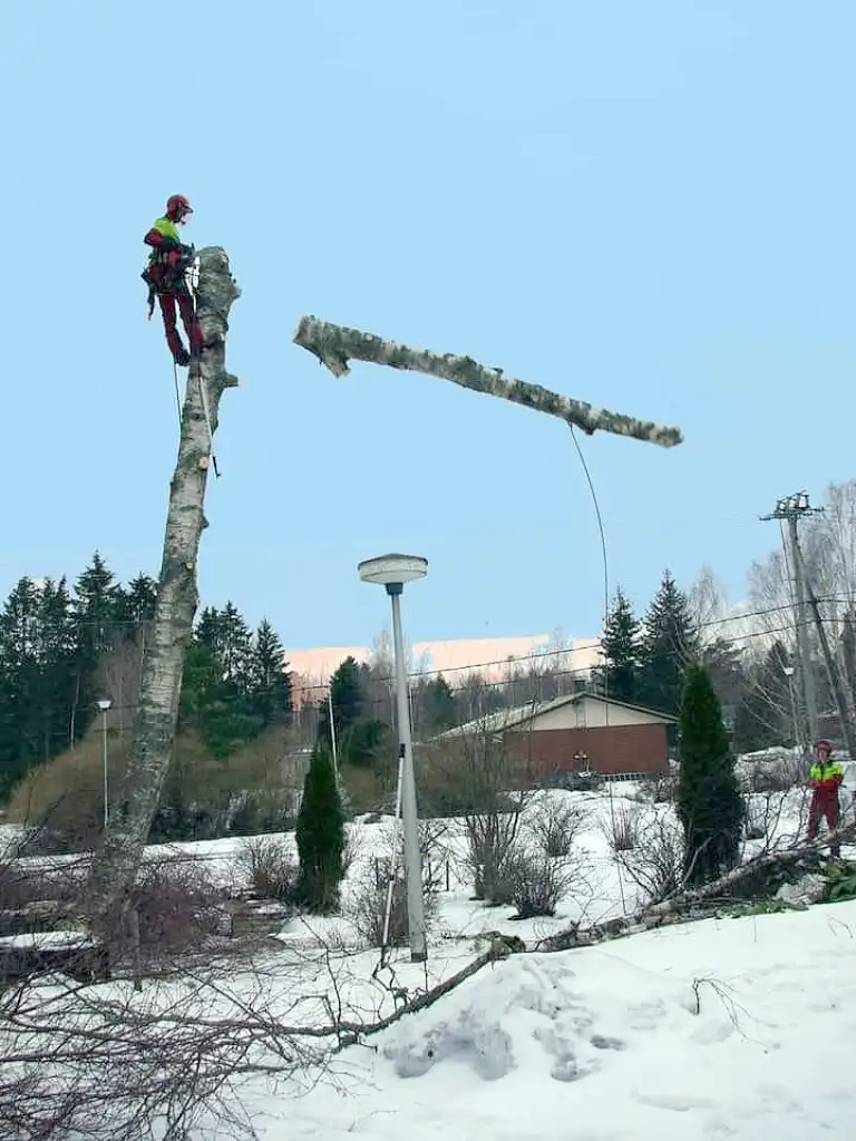Kiipeilytekniikalla puu voidaan purkaa turvallisesti osissa myös ahtaissa paikoissa. Kun runko ja oksat lasketaan alas hallitusti, piha säästyy ja työ voidaan usein tehdä ilman raskasta kalustoa. Se tarkoittaa käytännössä vähemmän järjestelyjä, vähemmän lisäkuluja ja vähemmän jälkiä pihalla. Eli nurmikko kiittää, ja pihakin pysyy pihalta näyttävänä.