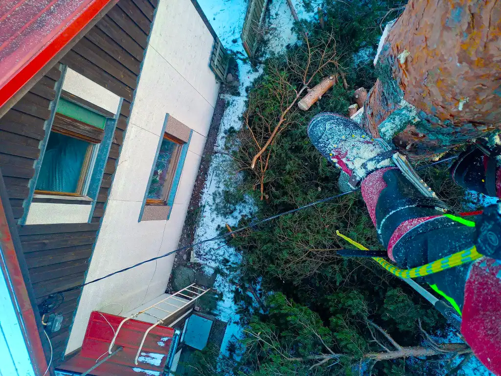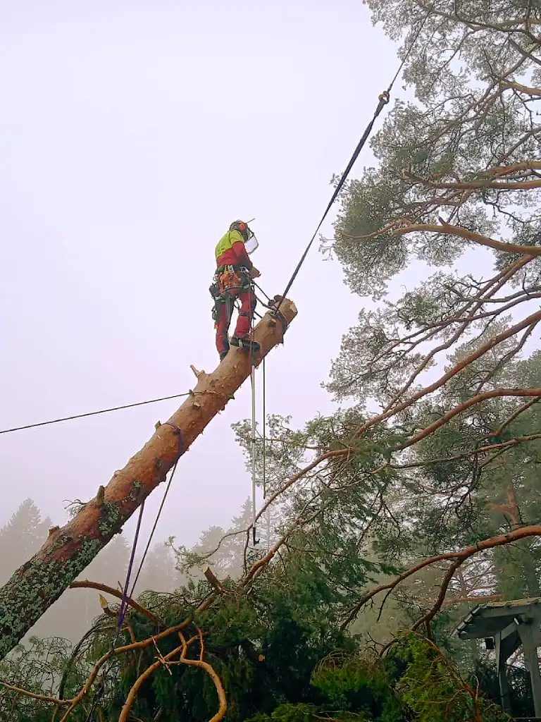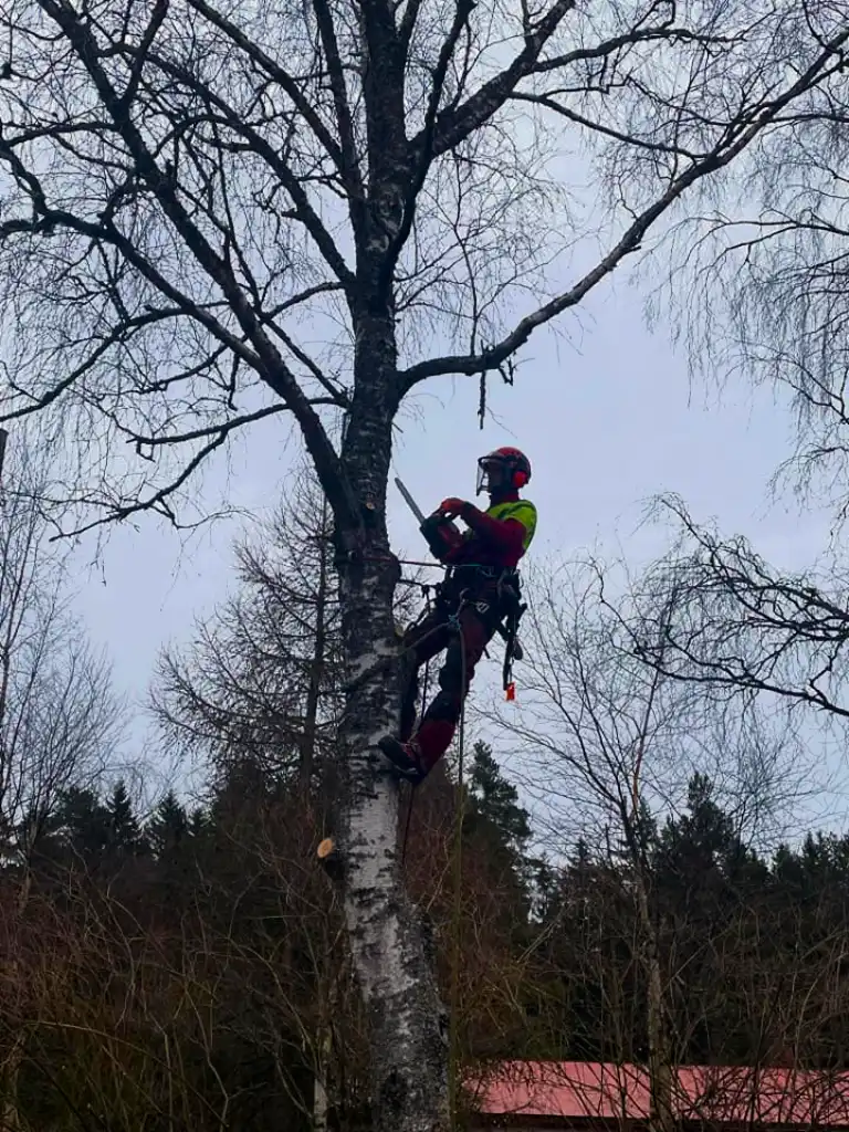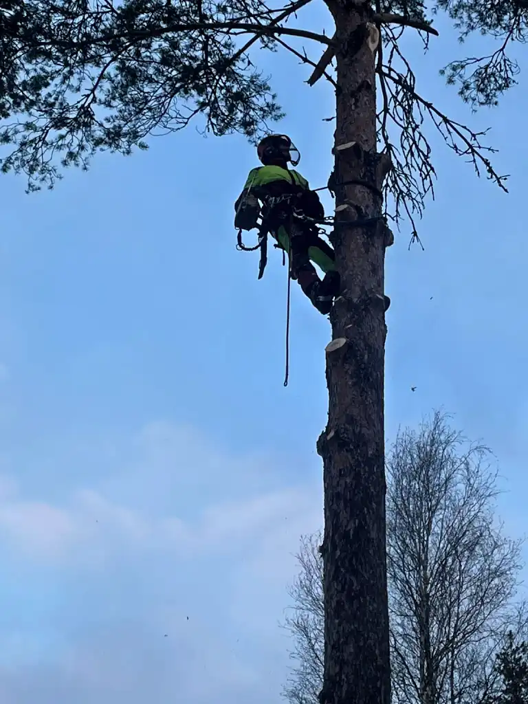 Kiipeilytekniikalla puu voidaan purkaa turvallisesti osissa myös ahtaissa paikoissa. Kun runko ja oksat lasketaan alas hallitusti, piha säästyy ja työ voidaan usein tehdä ilman raskasta kalustoa. Se tarkoittaa käytännössä vähemmän järjestelyjä, vähemmän lisäkuluja ja vähemmän jälkiä pihalla. Eli nurmikko kiittää, ja pihakin pysyy pihalta näyttävänä.
