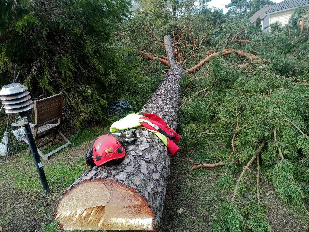Jälkeen ✓: työ toteutettiin hallitusti kohteen mukaan, jotta puu saatiin alas turvallisesti ilman vahinkoja.